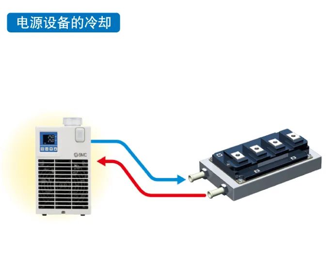 △温控器的结构如下图所示:将珀尔帖元件(热模块)放置在循环液用和散热用的热交换器之间,控制供给的DC电源,高精度控制循环液的出口温度。循环液返回储液罐,由泵加压输出,通过热交换器、温度传感器,由OUT出口排出。