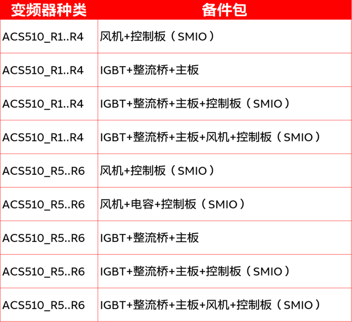 ACS510的变频器服务提供备件包服务,主要包含: