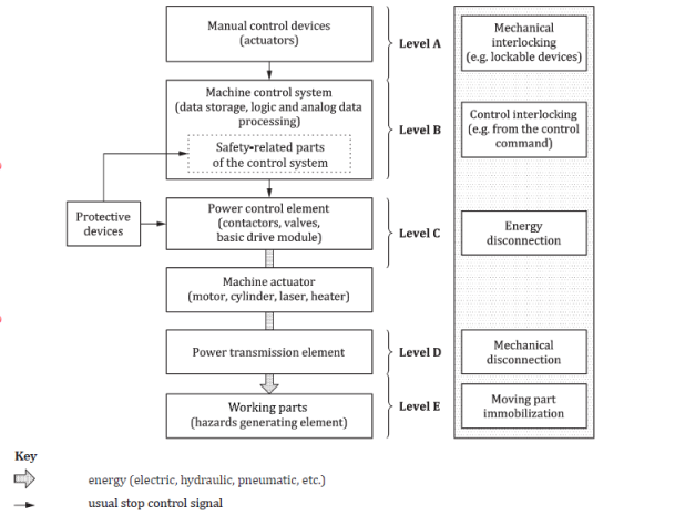 · Level B/C通过机器自动给出的控制信号,如安全门上的联锁开关,通过给出停止信号(Level B)或切断能量源(Level C) 来防止意外启动。