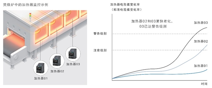 以往,难以根据加热器的个体差异或温度影响确定更换时机,导致加热器在更换前因为断线而意外停机,或者过多考虑偏差而在到达使用寿命前废弃加热器,因此在确定维护时机时,需要同时考虑突发停止的风险以及成本。而【欧姆龙加热器状态监视器K7TM】可通过监控设备的加热器状态,掌握各个加热器的老化趋势,能够从快速老化的加热器开始实施更换。由此,可在提高装置运转效率的同时降低维护成本,从而提高加热器的维护品质。