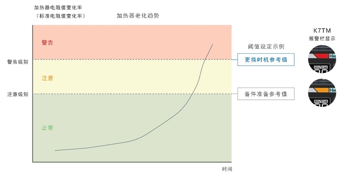 以往没有测量加热器老化趋势的手段,只能凭借个人经验或直觉在到达寿命前进行更换,会造成浪费。【欧姆龙加热器状态监视器K7TM】则通过监控加热器电阻值变化率捕捉老化趋势,并依据加热器断线风险增大的变化率状态设定阈值,无需仰赖个人经验,根据数据即可在合适的时间实施维护。