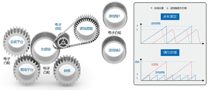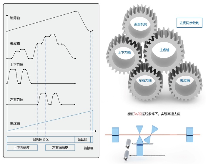 在3s/根的送线条件下,同步时间仅2.4秒,如此短的时间内实现双面去皮动作,通过传统的时序控制方式很难实现,因而欧姆龙采用同步控制方式,以实现真正的高速动态去皮。