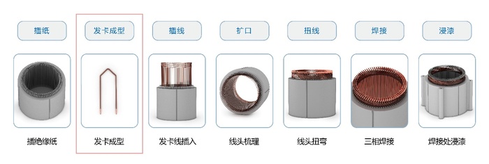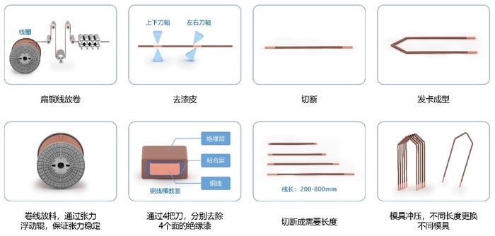 发卡成型机的主要功能,是将扁铜线经过去漆、折弯和成型,最终折叠成固定发卡式形状,是整个发卡电机定子组装线上最为关键的设备之一。