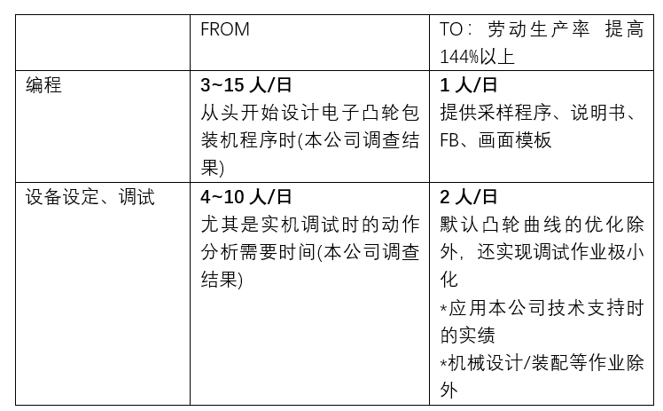 “通过‘横枕式包装机专用程序的FB化’,解决了‘由于运动控制程序的设计经验不足,导致工时增加、设备交货期紧’的问题”。