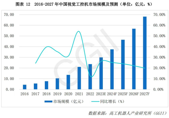 GGII 统计数据显示,2022年,我国视觉工控机市场规模约为 23.71 亿元,同比 2021 年增长 12.62%,GGII 预计,至 2027 年我国视觉工控机市场规模将超过 65 亿元。