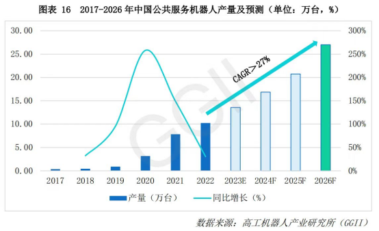 根据GGII统计,2022年中国公共服务机器人产量 10.24 万台,同比增长30.61%,预计