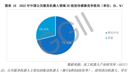 从 3D 视觉传感器参与者来看,主要有奥比中光、英特尔、索尼、英飞凌、银牛微电子等,其中,2022 年奥比中光在中国服务机器人领域的市占率超过70%。
