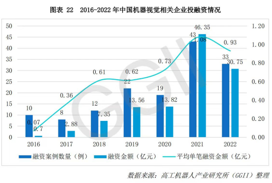 据不完全统计,2022 年中国机器视觉行业共发生融资33起,涉及金额近31亿元,其中,大部分融资主要集中于3D视觉、视觉芯片、视觉软件平台等领域。同比2021年,机器视觉融资案例数量下滑约 25.58%,融资金额下滑约 64.19%,平均单笔融资金额从 2021 年的 1.08 亿元下降至 0.93 亿元,融资市场开始收缩。