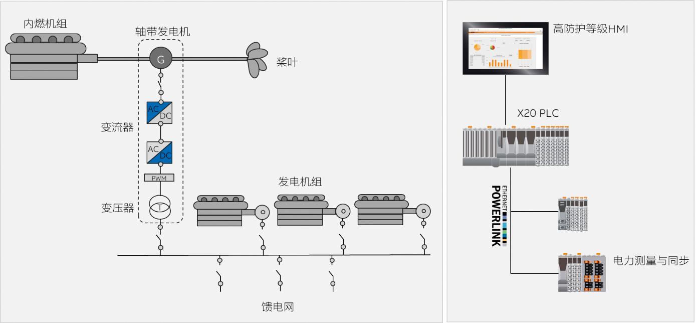 整流/逆变系统使得机组可以提供恒压恒频电能输出,当然,轴带发电机也可以作为电动机输出,这由整个电力系统的转换来实现。贝加莱的控制系统提供针对机组的发电转速采样、机组电流/电压、频率的高精度采样,以及电机功率控制,整流与逆变中的控制功能。