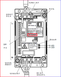 ACS800的型号标签贴在散热器上,序列号标签贴在变频器背面的上部,如下图所示: