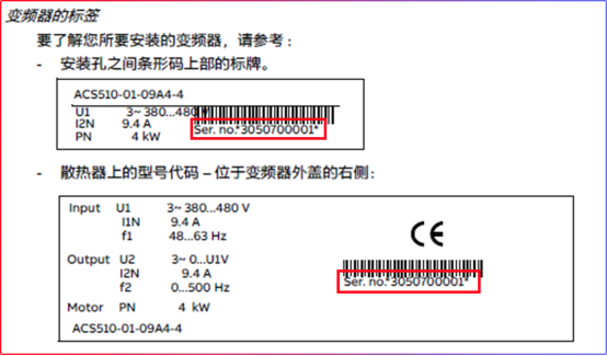 ACS510序列号说明:第1个数字3是制造工厂代码,第2、3位代表制造年份(例如:上图中示例序列号中的05代表2005年),4、5位代表制造周次,后5位代表生产序列号,从00001开始计数。