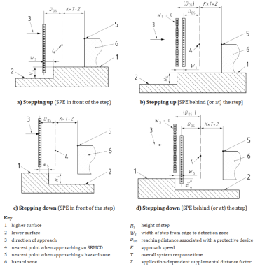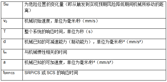 如果加速度和减速度已知且恒定,则基本原理与静态方法相同,但必须考虑到一个额外的参数SM,它表示危险位置的变化(即机器在响应时间里跑了多远)。这将产生以下公式,当人的接近方向不完全清楚时,将使用该公式: