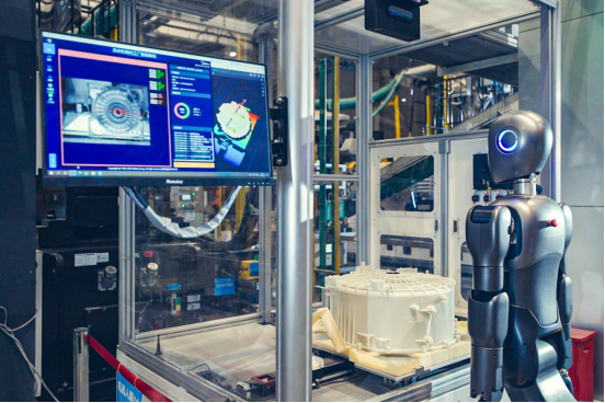 “美罗”是美的集团人形机器人创新中心自主研发的面向工业场景的人形机器人,作为工厂具身智能体的核心执行单元,在工厂大脑的统一调度下,与品质、DMS(日常化管理)、TPM(全员生产维护)、EHS(环境、职业健康与安全管理)等工厂智能体深度协同,结合多模态感知技术和具身智能操作技术,自主执行品质首检、DMS巡回会议、TPM巡检、EHS巡检等高频次任务,实现实时响应与全流程自主决策。如它在执行首检送检任务,会将注塑成型的后桶搬运至智能首检台,由集成的高精度自研3D相机自主进行尺寸外观检测。质检数据会实时同步至品质智能体,生成首检工单闭环,只有当系统确认部件合格后,才会调度机器人返回取件。如果检测不合格,会进一步协同工艺智能体、TPM智能体,对注塑机参数优化调整。