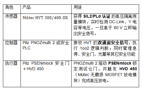 针对高压测试台的安全防护,德国Mütec与PILZ公司联手推出了一套极具针对性的安全解决方案,通过功能安全链的“传感器-控制器-执行器”的不同分工,确保在开门前强制完成高压放电。