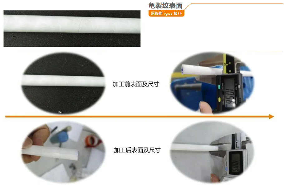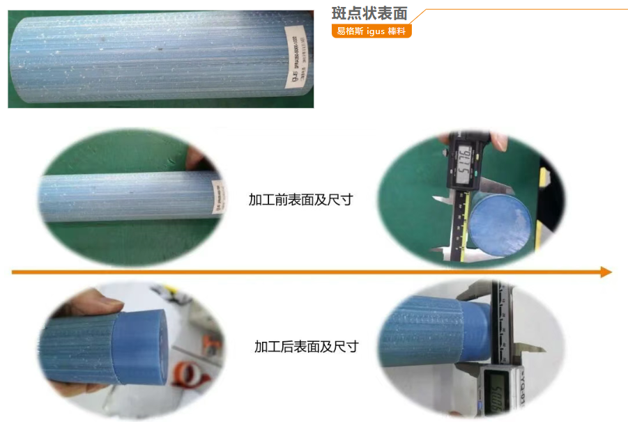 如以上实测:易格斯(igus)棒料均为正公差,在加工到公称尺寸时,表面完整,没有任何因为表面不同而有缺陷。