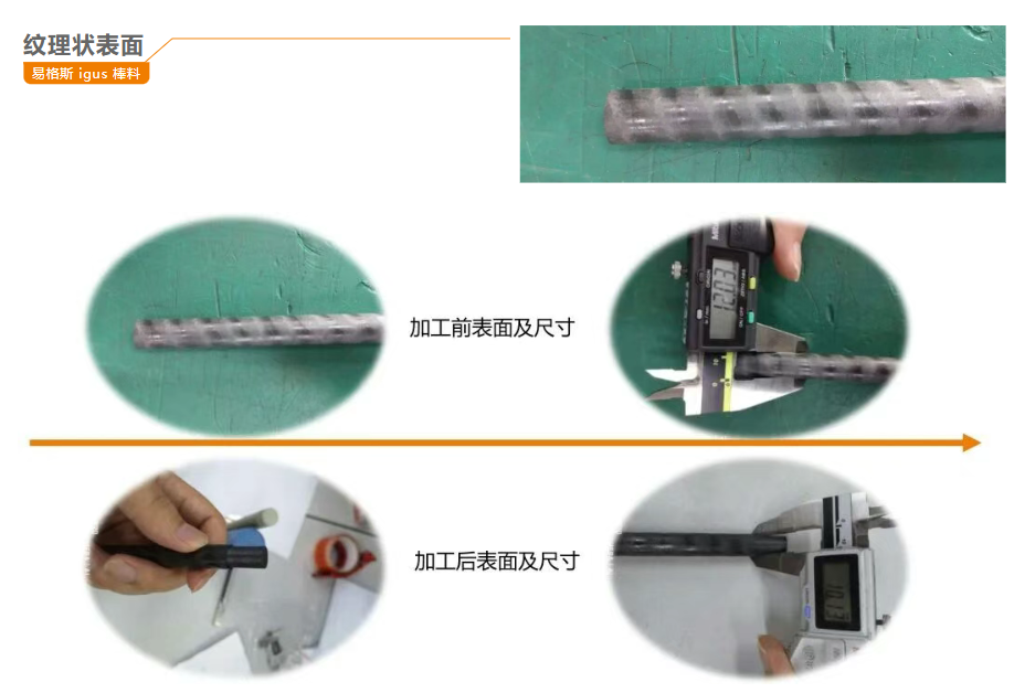 工艺形成的正常纹路基本不影响使用,并且易格斯(igus)严格确保提供的棒料本身为正公差,加工表面后仍符合公称尺寸范围。以下是不同表面棒料在家加工前和加工后的直径实测图: