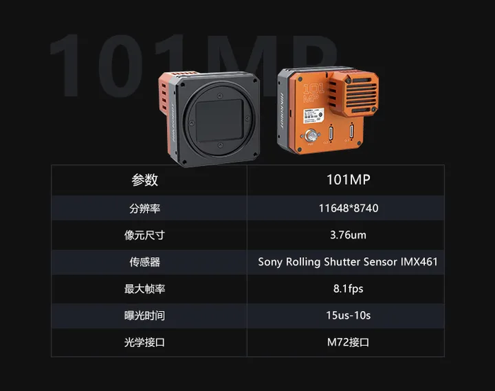 致力于像素提升,高分辨率相机再添新兵。全新发布的101MP相机,与151MP的像元尺寸一致,幅面稍小,具备更高帧率;支持16bit输出,可更好地进行细节采样及呈现。