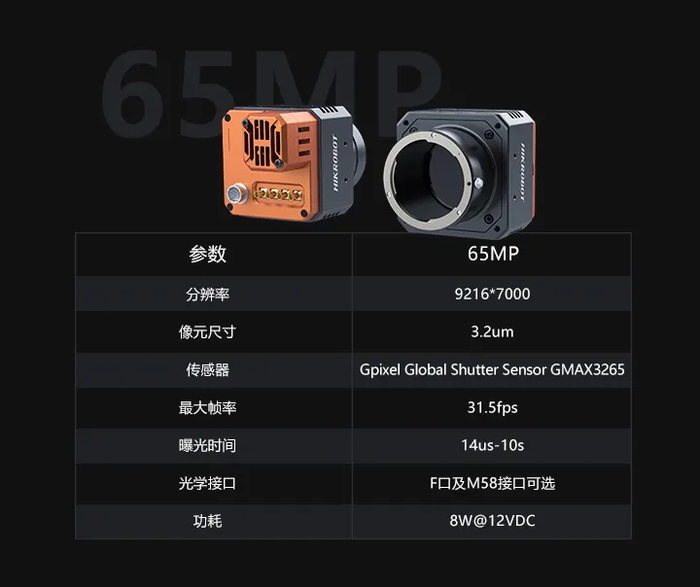 65MP相机使用CoaXPress接口,采集速度可达31fps,完美适配于半导体芯片、PCB检测等电子半导体应用。