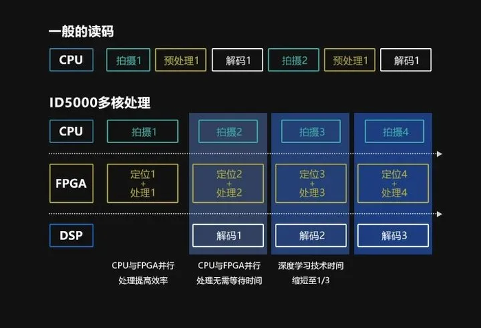 ID5000系列智能读码器,采用多核深度学平台芯片并行处理的方案,读码效率更高。