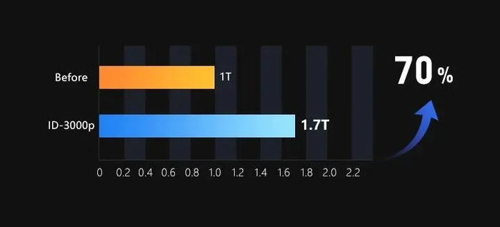 ID3000Pro智能读码器升级了深度学习芯片,整体算力由1T提升70%,达到1.7T;同时新增4种条码码制,平均帧率提升超过40%。