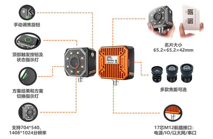 SC2000Pro结构精心设计,在小巧机身中容纳多种组件:多种型号的镜头和光源,使用易拆卸设计;丰富的指示灯用于显示当前结果;机身侧面的调焦旋钮等;便于视觉项目调试。