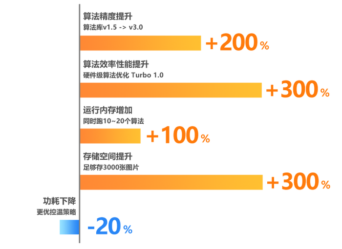 SC2000Pro进一步优化算法库与硬件处理,使性能大幅提升。内部空间方面,在内存空间、方案存储空间、存图空间增加100%以上;算法性能方面,算法执行效率、算法精度提升200%以上。以内存空间为例,SC2000Pro单个方案可内置10~20个算法模块同时运行,大大提升了自由度。