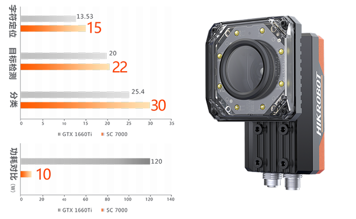 SC7000将传感器、镜头、光源、处理芯片等集成与一体,内置AI处理芯片,算力强劲,实测数据表明,SC7000的处理能力能媲美桌面级显卡,同时功耗不足显卡的1/10。