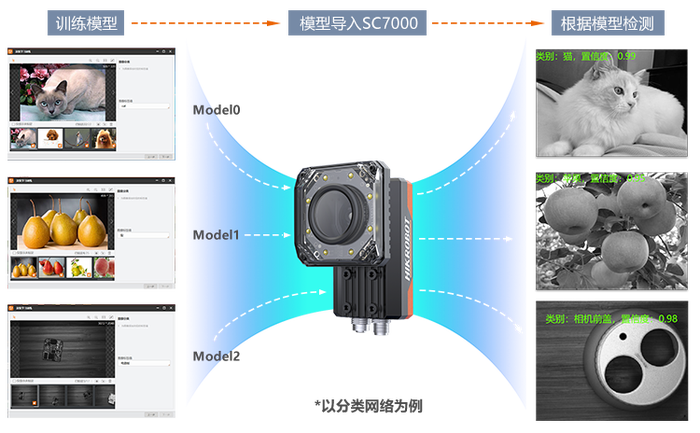针对机器视觉应用行业差异化、场景碎片化等特点,SC7000提供模型训练工具,支持使用者自主训练,实现一机多能。以分类网络为例,根据训练样本,可以实现工件识别、动物识别、水果识别等。