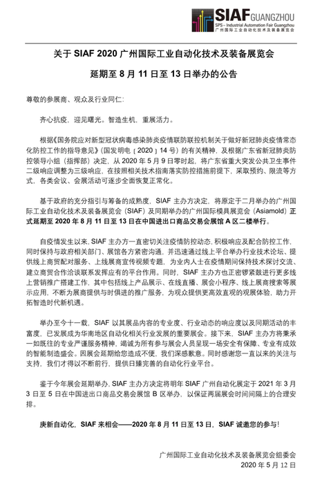 广州光亚法兰克福展览有限公司董事长杜承华先生代表主办方表示:“ 在与业内的合作伙伴协商后,我们很高兴为SIAF和Asiamold确立了新的展会日期。我们相信现在是一个重要时机,通过SIAF和Asiamold,我们将致力为工业自动化技术及模具领域提供有效的平台,从而帮助行业复苏。”他续说:“我们也会竭尽所能,为所有业内人士提供一个安全的展会环境。我们稍后将会公布更多相关的防疫措施。”