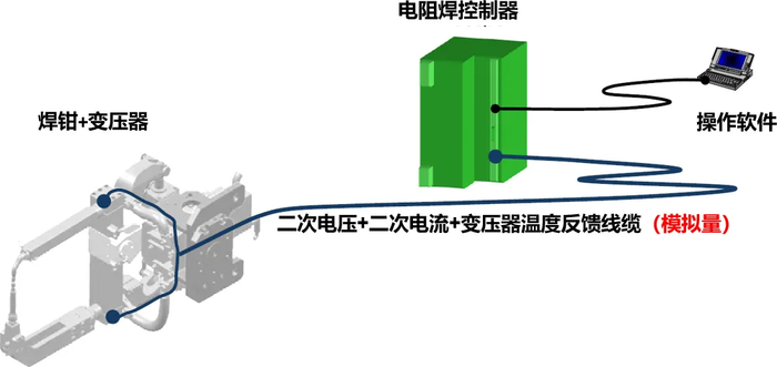想要在传统的电阻焊系统中监控整个焊接过程,制造商需要对焊接过程的电流,电压,压力,温度等主要工艺参数数据进行实时测量,并通过硬接线将这些测量值以模拟量的形式反馈到焊接控制器,以实现测量值与设定值的精确比较和控制。