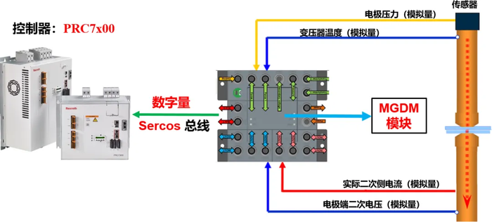 面对这样的难题,我们推出了全新的MGDM(Measuring Gun Data Module)模块信号测量处理方式 ,它与焊接控制器,驱动器等一起组成了博世力士乐新型电阻焊系统。