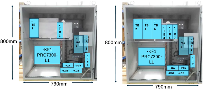 这两种焊接控制柜内主要设备分布如下图所示。其中PRC7300 为焊接控制器,TB2、TB4、TB6为焊钳电机驱动器,TB3、TB5、TB7为修磨器电机驱动器。
