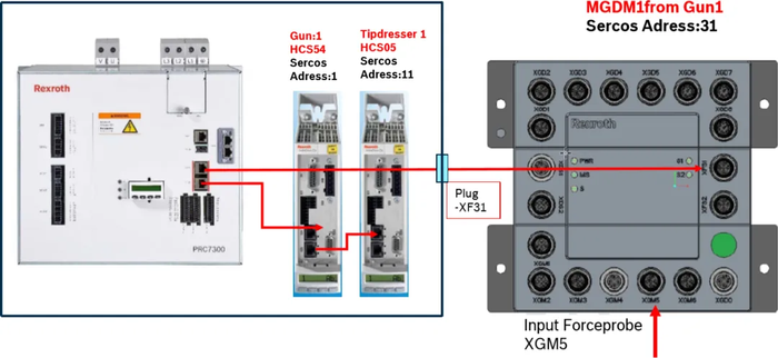 ● 单焊钳系统:MGDM模块直接通过Sercos总线与焊接控制器上的XFS1接口连接,此时MGDM模块的拨码通道为1。