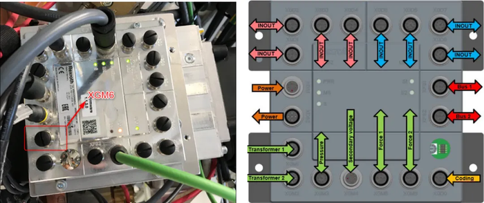 但此类硬接线的方式在焊接过程中测量的工艺参数数据传输是从焊钳电缆→机器人管线包→机器人底座接口→焊接控制柜,这就造成了潜在的风险:控制电缆传递的这些信号为较弱的模拟信号,很容易在存在多接口端的传递过程中,以及受到现场强磁场等环境因素的影响出现信号变形和衰减,从而直接影响焊接工艺参数的稳定性,最终影响焊点质量。