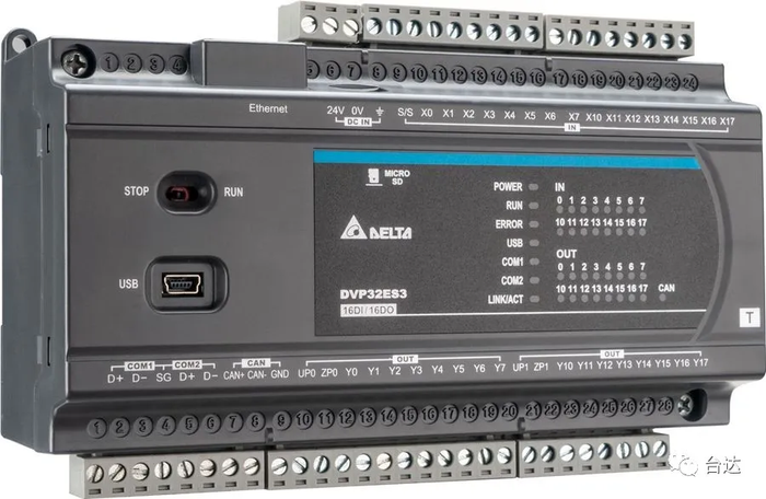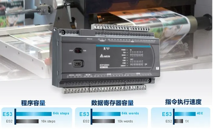 以性能卓越、功能丰富、高效可靠等特色著称的台达小型可编程控制器(PLC)DVP-ES系列自推向市场以来备受市场的好评。作为前代DVP-ES2系列的升级产品,DVP-ES3系列更加注重产品与系统的整合性能,在运算处理、扩展性、兼容性、可靠性等方面都有了显著提升。DVP-ES3系列搭载全新高速处理器,指令执行速度提升了40倍。内建4组200KHz高速输入/输出(最多可达8轴)、8轴台达专属CAN模式的定位应用,可实现丰富的运动控制。此外,支持主流通讯总线、FB功能模块、Micro SD卡等功能,使DVP-ES3系列能够整合更多的系统,控制能力大幅提升。