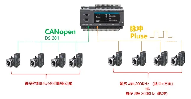 DVP-ES3核心采用SoC架构,内建最多4组200KHz 高速输入/输出,可进行直线与圆弧插补的运动控制。此外,支持台达专属CAN驱动通讯模式以及CANopen DS301通讯协议,可提供8轴点对点定位控制。