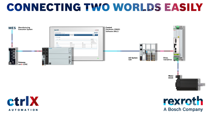 信息技术(IT)和运营技术(OT)一向都各自独立,分属两个不同的世界。但如今,时代已大不相同。面对不断变化的市场需求,制造商必须以更灵活、更迅速的方式做出反应,以便在短时间内对生产做出调整。如果为实现此目的所需要的数据是存储在不兼容的独立系统中,便只能通过复杂的手动干预才能做出更改。而ctrlX CORE 作为网关,可以在生产层面上为IT系统(例如MES)和OT系统架起一座桥梁。采用这一解决方案,用户便可以安全地将来自MES的数据直接发送给机器控制系统。其结果是,无需额外干预即可针对不断变化的条件做出反应。
