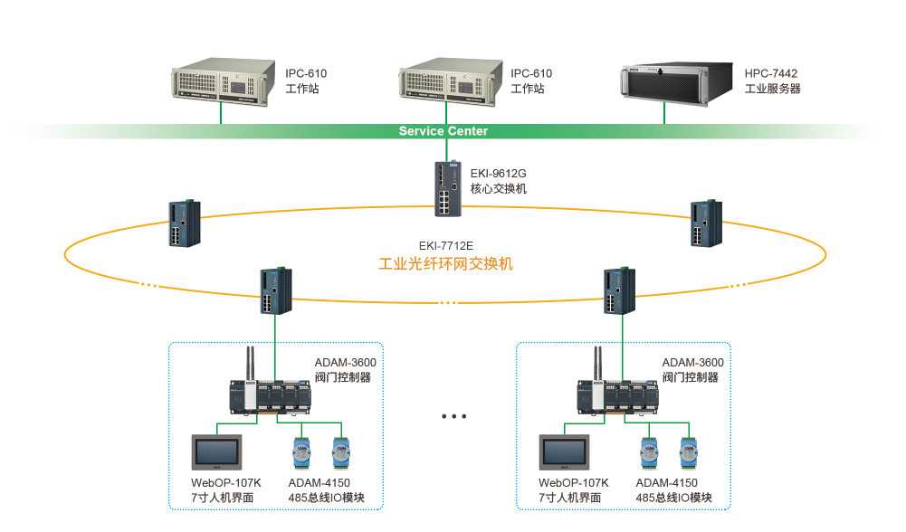 研华地下管廊阀门远程监控系统解决方案包括完整的软硬件系统解决方案。控制主站采用了 ARM架构,具有强大的数据处理能力,基于工业光纤的网络架构在潮湿的环境中具备更好的安全性。本地控制器内部搭载WISE- EdgeLink数据采集管理软件及KW编程系统实时系统内核,实时逻辑控制及数据处理云计算,搭配WebOP-107K作为人机交互界面,实现本地人机交互控制;通讯层面采用研华EKI-7712E宽温工业网管交换机,搭建18个环廊监控站的稳定工业光纤环网,同时与信息中心三层交换机EKI-9612G实现管理及跨网段数据通讯,保证数据传输通讯稳定性。后台监控站点采用研华IPC-610工业计算机及HPC-7442工业服务器,分别搭载SCADA系统及后端平台软件系统进行调度运维及监控管理工作。