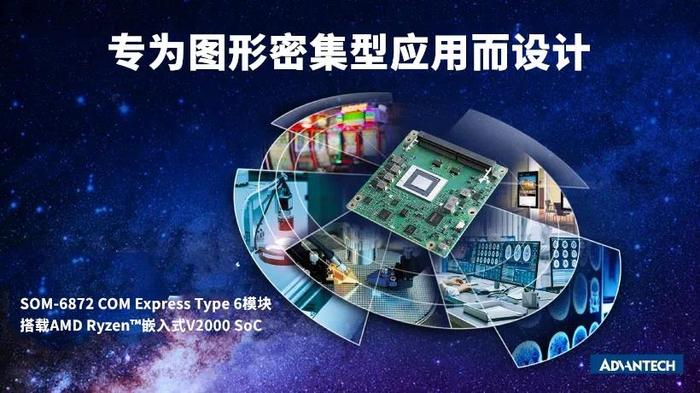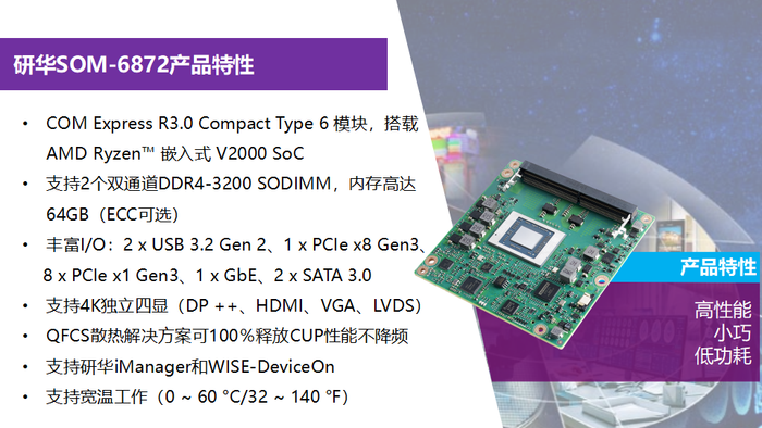研华推出搭载AMD Ryzen™嵌入式V2000 SoC的SOM-6872 COM Express Type 6模块。该模块功能强大、外形紧凑,具有出色性能,支持高达8核、16线程、睿频加速(高达 4.25GHz)和 4个独立4K 显示;采用内置 I/O 接口,无需额外的显卡即可提供出色的图形显示性能。SOM-6872是数字标牌、医疗影像、机器视觉、游戏及其他图形密集型应用的绝佳选择。