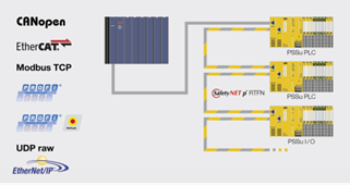皮尔磁深耕机械安全领域,众所周知。因此,虽然PSS 4000系统是一款涵盖标准的自动化系统,但是在研发之初,皮尔磁从基础构架方向上就充分考虑了PSS 4000系统的功能安全性,能很好地覆盖PSS 3000安全PLC系统的应用范畴,在安全性能、安全等级、安全可靠性、安全使用性等方面完全达到甚至超越了PSS 3000。在硬件方面,PSS 4000很好地兼容了PSSuniversal的模块化远程I/O站点,换句话说,PSSuniversal的I/O模块能够直接在PSS 4000系统中使用,使其具备了灵活性、模块化、体积小、热插拔等特点。把PSS 4000系统当作纯安全系统来使用,能够实现安全数字量控制、安全模拟量控制、安全以太网分布式控制等安全要求。其开放式的第三方网络通讯协议,使其能够支持CANopen, EtherCAT, Modbus TCP, PROFInet, Ethernet/IP, TCP, UDP, PROFIBUS DP等协议,实现与第三方普通PLC之间的“无障碍互通交流”。