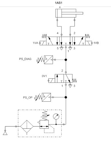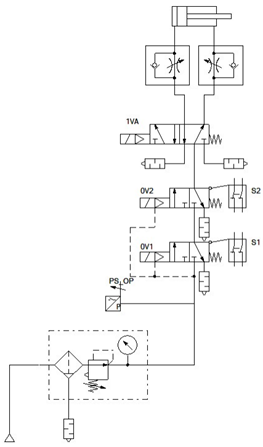 Ø 气缸的往复运动由换向阀1VA控制,安全功能由带阀芯位置监控功能的安全阀0V1&0V2控制