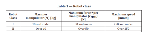 新版本引入了两个机器人类:Class 1(适用于低负载的机器人,基于合理预见误用设计);Class 2(适用于负载较大的机器人)。CLASS I和CLASS II机器人的分类区分标准简述见下表。需要注意的是,机器人只要不满足Class I中的任意一个条件,就会被归类为Class II机器人。
