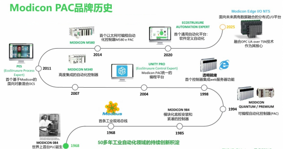 跨越半个多世纪的工业自动化发展史,Modicon这个名字始终熠熠生辉。从1968年世界上第一台可编程逻辑控制器Modicon 084问世,开启工业控制新纪元,到如今Modicon M580 ePAC深耕市场十载,这个承载着施耐德电气五十余年技术积淀的品牌,始终与全球工业发展的脉搏同频共振。