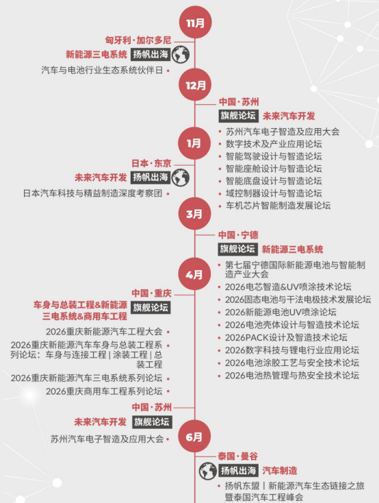 2026年,我们将推出多种活动形式,覆盖旗舰论坛、闭门峰会、主题系列会议、Workshop科技工坊、Techshow高新科技发布、圆桌对话、科技导览、扬帆出海、先锋奖项、走进智造、商务酒会等全维度活动,为您呈现一场多元化的创新生态体验。从聚焦冲焊涂总工艺的新能源工程大会、探索前瞻开发与测试技术的专业论坛,到深度研讨前沿科技的TechShow & Workshop;从沉浸式国内外智造产线工厂考察,到促进深度链接的圆桌会议、交流晚宴与精准配对,通过旗舰峰会、主题会议、Workshop科技工坊、出海及商务考察等全维度活动打造集技术洞察、知识共享与商业合作为一体的高端平台。