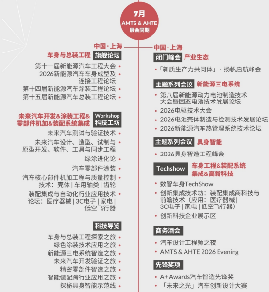 作为汽车技术与工程行业的盛会,第二十一届上海国际汽车制造技术与装备及材料展览会(AMTS 2026)将于 2025 年7月 8-10日在上海新国际博览中心 W1-W5 ,E1-E2馆举办,AMTS聚焦汽车研发、设计与制造的每一环,全面展示汽车制造产业链创新技术与产品,通过全新联接平台,贯穿线上、线下全媒体渠道,在全年周期,为海内外汽车技术与工程领域系统集成商、一二级供应商、整车及零部件研发与制造工程人员搭建一站式交流平台。详情请至:www.shanghaiAMTS.com.cn