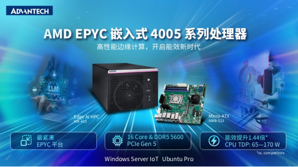 全球工业物联网与嵌入式计算领域供应商研华科技(Advantech)宣布,其边缘产品线正式引入AMD EPYC嵌入式4005系列处理器,进一步拓展高性能边缘计算布局。该处理器平台采用服务器级架构,最高可达16核,并提供长期供货保障。相较同类竞品 CPU,其性能提升高达 1.44 倍,可为工业自动化、机器视觉、机器人、医学影像及边缘人工智能等领域,提供稳定可靠、可灵活扩展的计算支持。基于这一高效能架构,研华科技重磅推出紧凑型边缘人工智能高性能计算系统AIR-420,以及Micro-ATX工业主板AIMB-523。两款产品均支持双通道64GB DDR5 5600 ECC内存、PCIe第5代接口与广泛的TDP配置范围,并可兼容研华一站式软件套件,内含GenAI Studio、SUSI API及DeviceOn远程管理平台。AMD EPYC嵌入式4005系列全系产品,凭借新一代带宽、拓展能力与性能表现,加速推进应用升级进程。