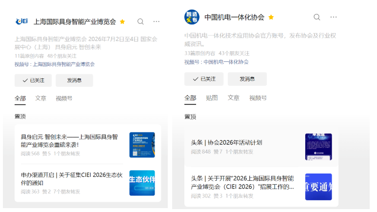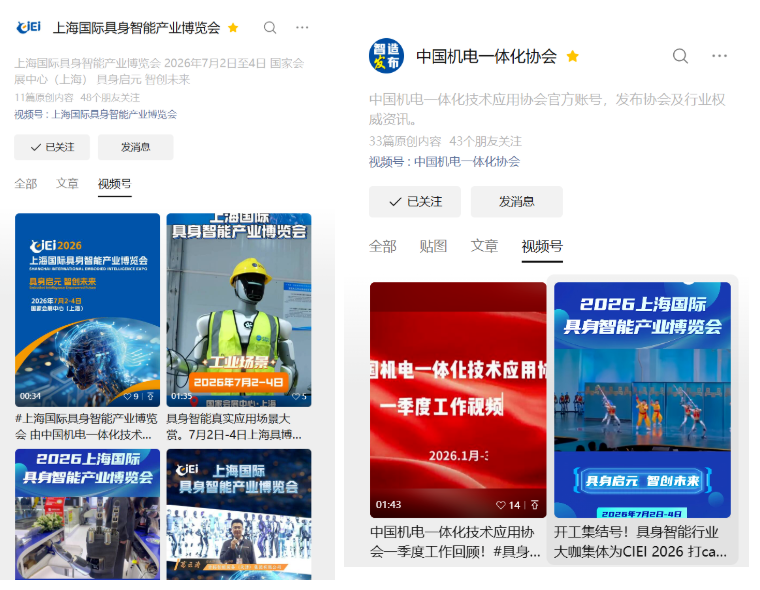 CIEI以及中国机电一体化技术应用协会视频号持续输出行业简讯、大咖采访、招展招观等多元化视频内容;协会视频号同步分发,扩大视频内容触达范围,以可视化形式增强传播感染力。